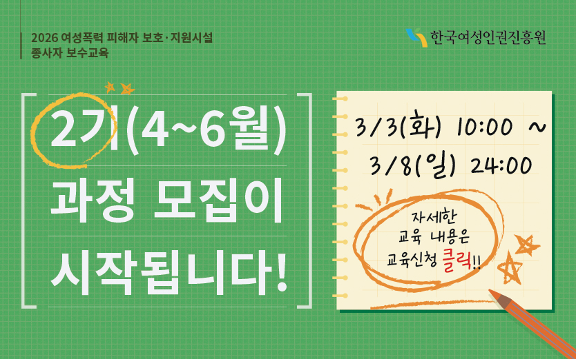 한국여성인권진흥원에서는 여성폭력 피해자 보호·지원시설 종사자를 대상으로 「종사자 보수교육」 사업을 추진하고 있습니다.