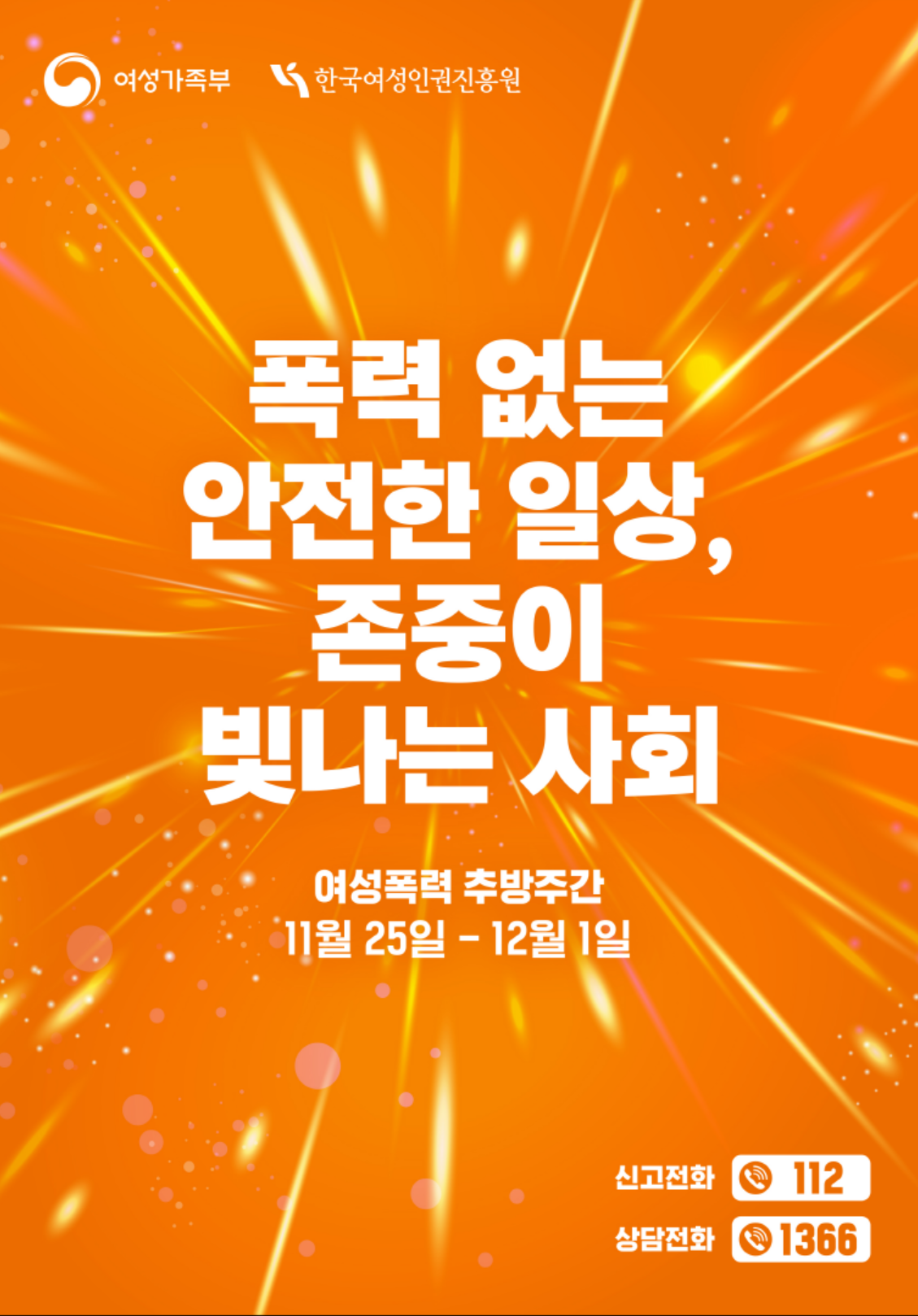 여성폭력 없는 세상은 멀리 있는 목표가 아니라, 바로 지금 우리의 관심과 참여에서 시작됩니다. 존중의 빛을 모아 모두가 안전한 일상을 누릴 수 있는 사회를 함께 만들어주세요.