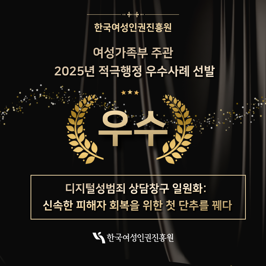 지난 8월 28일, 여성가족부 주관 「2025년 적극행정 우수사례 선발」에서 한국여성인권진흥원의「디지털성범죄 상담창구 일원화: 신속한 피해자 회복을 위한 첫 단추를 꿰다」가 우수사례로 선정되었습니다.